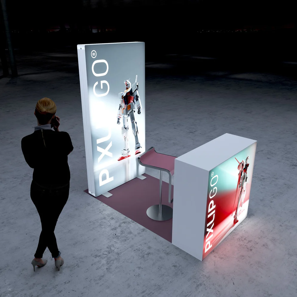 De PIXLIP S-14 beursstand is de meest compacte beursopstelling binnen de PIXLIP S-lijn. Met een vloermaat van slechts 1×2 meter (2 m²) is deze set ideaal voor kleine beursplekken, infopunten, productpresentaties en promotionele acties. Lees meer